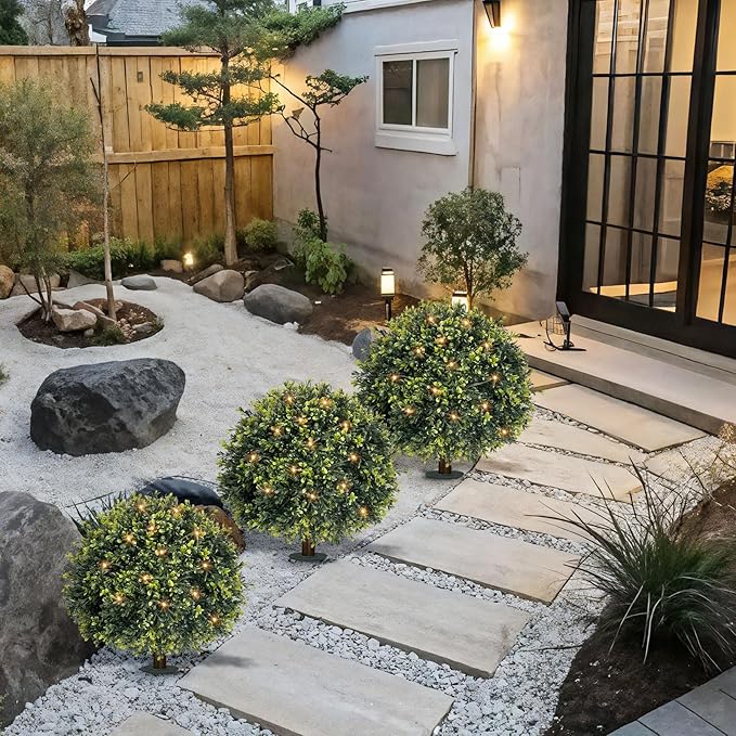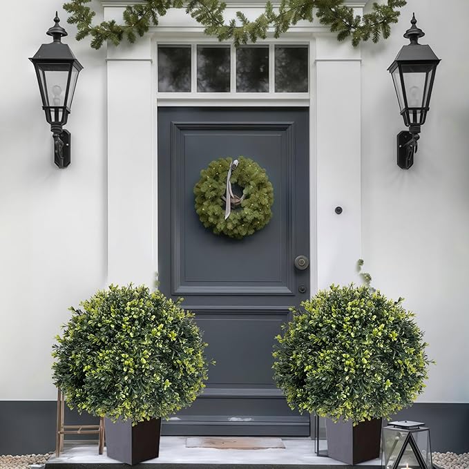• 【2 Boxwood Topiary Balls】 You will receive 2 Boxwood Topiary Balls Artificial Outdoor, each standing 24 inches tall. These outdoor faux plants are crafted from high-density PE simulated pine needles and feature natural wood-grain trunks, with lifelike gradient green leaves and intricate detailing. The UV-resistant coating ensures vibrant color retention for 3 to 5 years, making these artificial plants outdoor nearly indistinguishable from real foliage even up close.