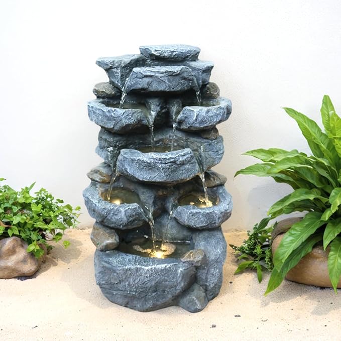 Water Fountain with Lights Outdoor Garden Decor,5-Tier Cascading Rock Waterfall for Indoor Patio Backyard Porch Art Decoration 21.6 Inches