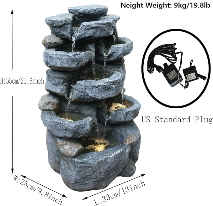 • Safety Waterfall: Rest assured with the UL certification of this outdoor water fountain. Designed with a US plug for 110V-120V 60Hz voltage input, it ensures safe and reliable operation. The cascading water sound adds a tranquil touch to your surroundings.