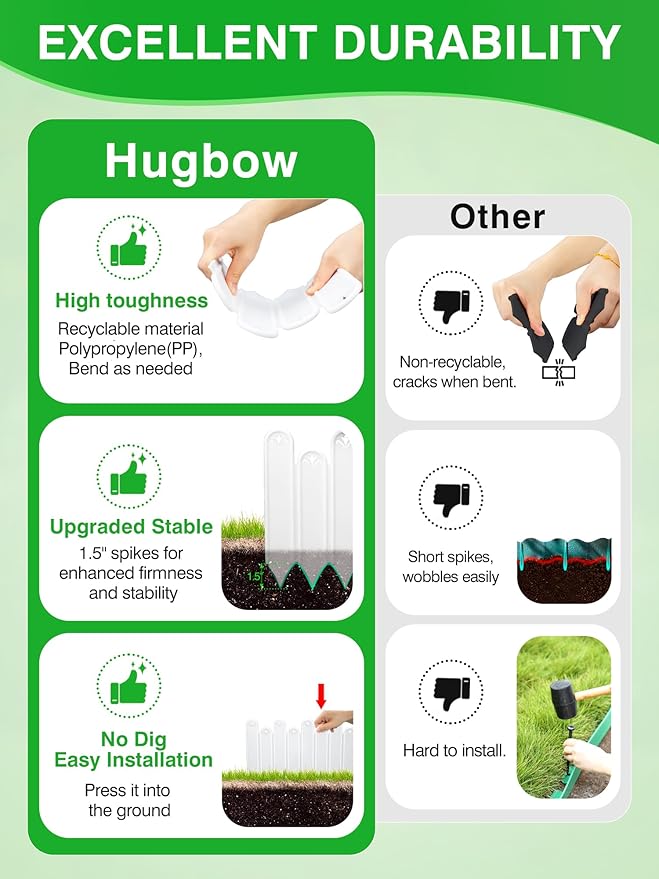 • 【Premium Garden Edging】The solid garden border edging is crafted from 100% virgin PP plastic—no recycled materials added. BPA-free, impact-resistant,and is not easy to corrode, ideal for long-term daily use. It is fully recyclable, helping to reduce resource waste.The high-tenacity design maintains its shape season after season, withstanding diverse climates (-20 °C to 80 °C) and resisting cracking, peeling, and breaking even under extreme weather conditions like rainstorms, or snowfall.