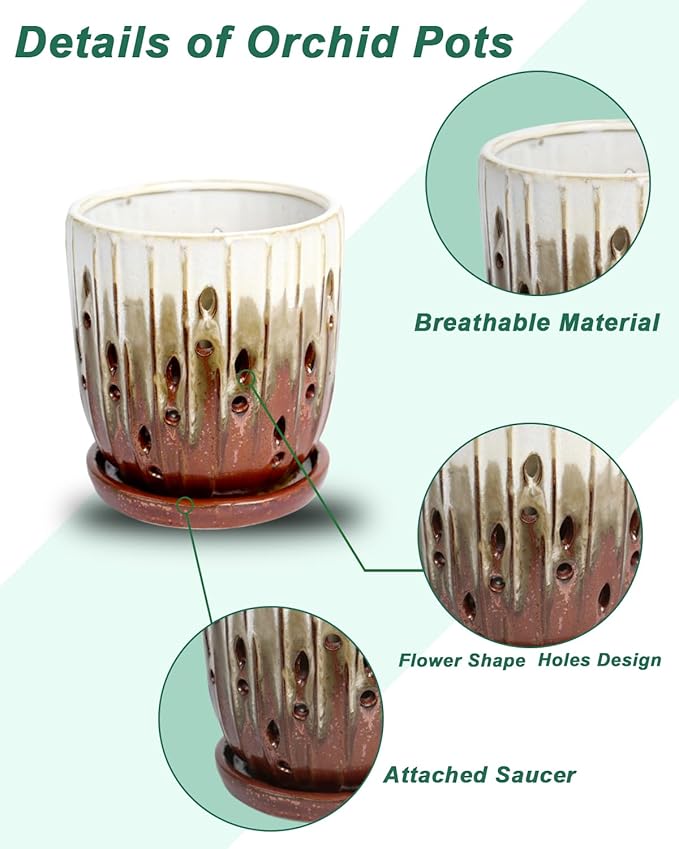 • 【Beginner's Perfect Pot】This orchid pot combines both aesthetic appeal and practicality, making it an ideal choice for beginners. Its reliable drainage system facilitates air circulation, while the ceramic glaze maintains its elegant appearance throughout the seasons. It is highly suitable for those who are just starting to grow flowers
