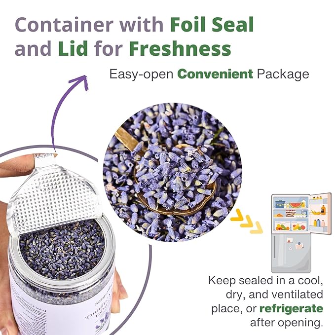 • 【Strong Aroma & Long-Lasting Freshness】Carefully Container packed with Foil Seal and Lid to lock in natural fragrance and flavor. The dried lavender food grade with rich, floral scent enhances culinary creations, home décor, and craft projects