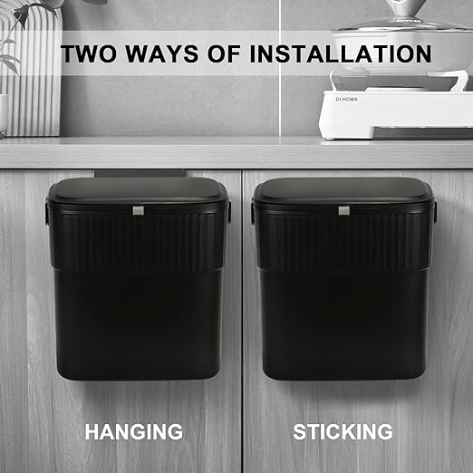 • Wall-mounted/Hanging Trash Can - This trash can has two different types of support components, both of which are easy to install, and you can install them in any position you find most comfortable. The one with adhesive strip on the back is for customers to place on a flat and clean vertical surface like bathroom wall. The other one can be hung on both sides of any cabinet door that is not thicker than 1 inch.