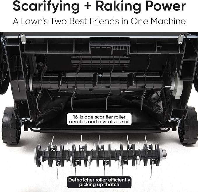 • Heavy-Duty Blade System – 16 Precision Blades + 20 Spring Steel Tines Equipped with 16 hardened steel scarifier blades and 20 spring-loaded tines for deep lawn penetration. Perfect for lifting thick thatch, breaking up compacted soil, and promoting healthier lawn growth.