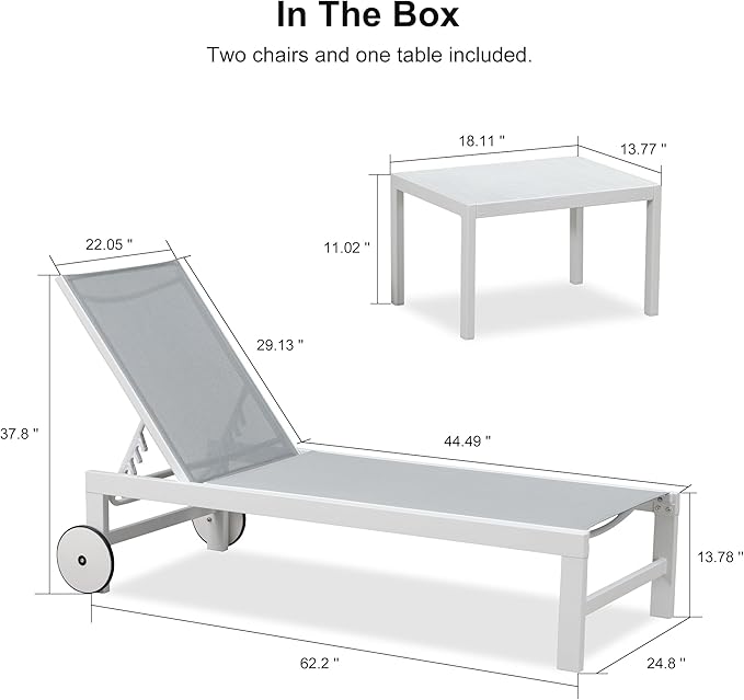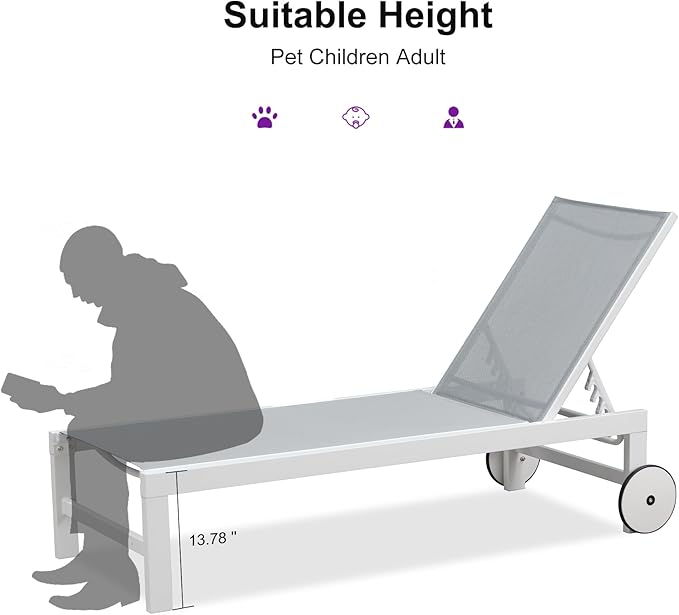 • White Aluminum Frame: The white chaise lounge offers superior sun protection; reducing heat absorption and maintaining a comfortable touch in any weather conditions; Additionally, it provides sturdy support with a maximum weight capacity of 270 pounds