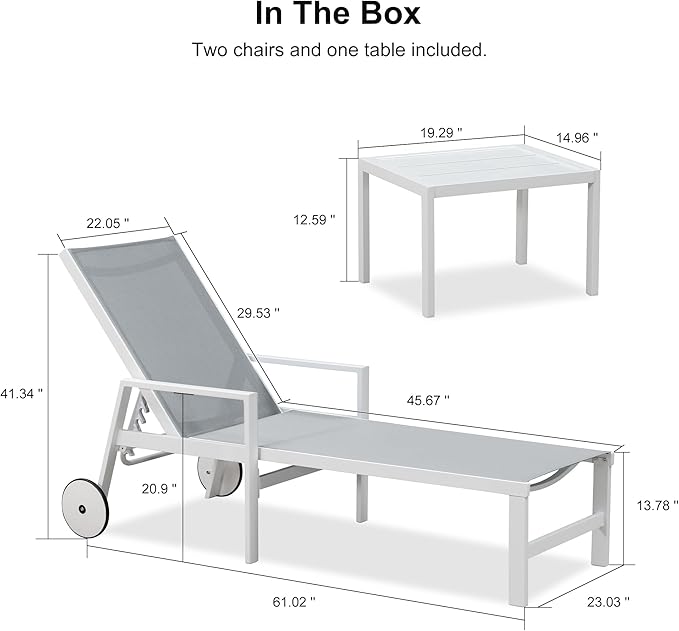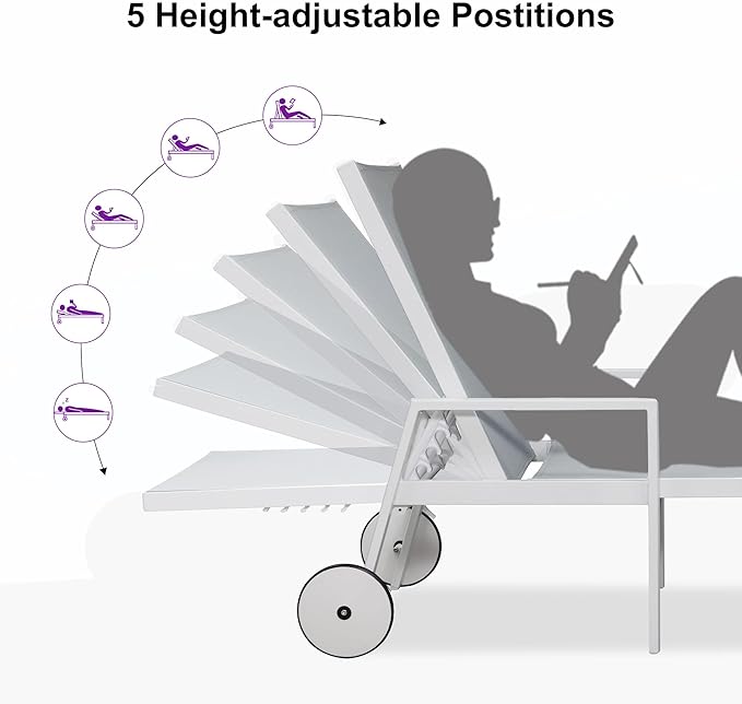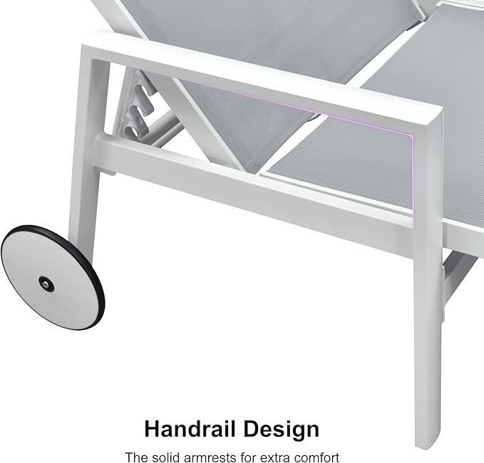 • White Aluminum Frame: This white aluminum alloy chaise lounge with armrests features a corrosion-proof powder coating; effectively protecting against sun exposure; allowing you to enjoy outdoor comfort anytime; anywhere. The aluminum frame also enhances its durability and sturdiness; withstanding a maximum weight of 270 lbs