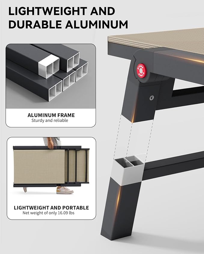 • 【DURABLE & LIGHTWEIGHT】Constructed with a powder-coated aluminum frame, the outdoor patio lounge chair is rust-proof for lasting use. Thickened tube walls make it support up to 400 pounds, catering to most body types. And lightweight design offers effortless portability and comfort for any outdoor adventure