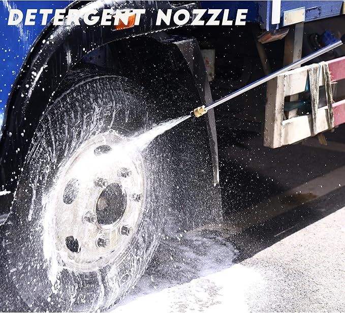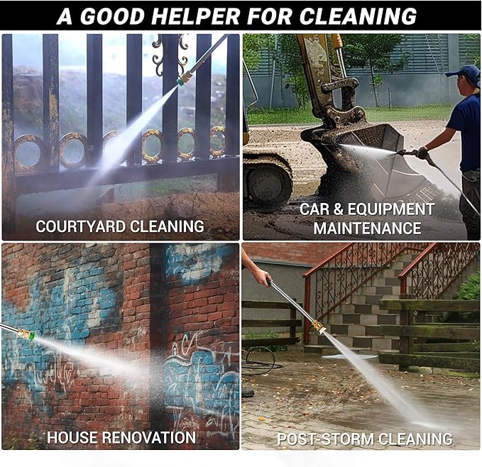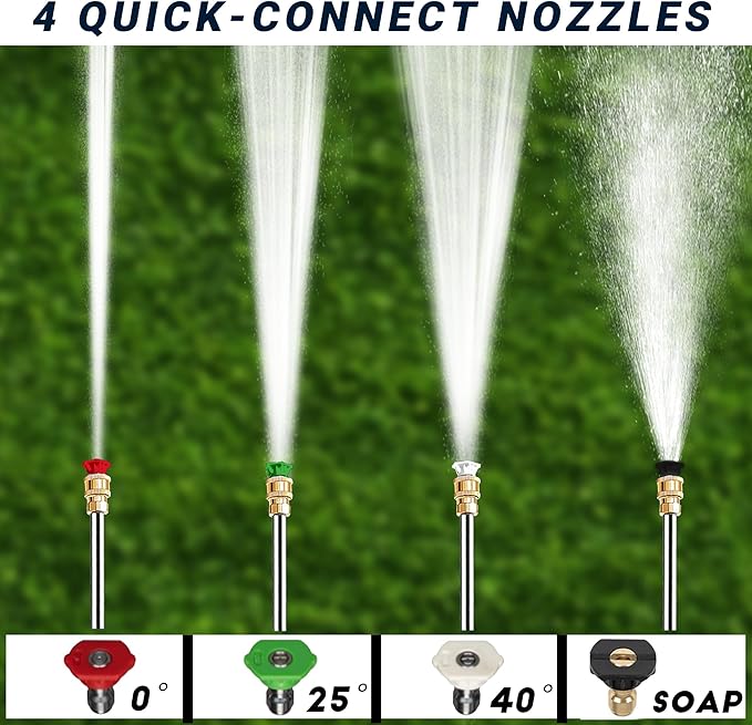 • 【4 Versatile Nozzles – Precision Cleaning Made Easy】Quickly switch between 0°, 25°, 40°, and soap nozzles to match any cleaning task. From blasting away tough grime to gently rinsing your car or patio furniture, this washer is perfect for gutters, sidewalks, decks, RVs, tools, and outdoor living spaces.
