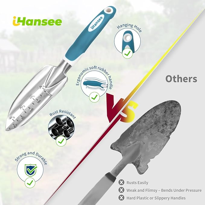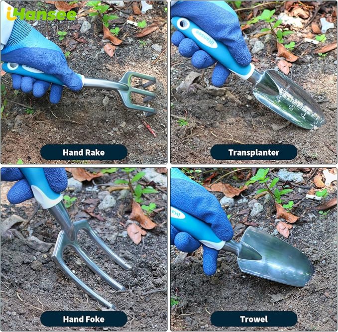 • Durable and Rust-Resistant Tools: Crafted from aluminum alloy, iHansee blue gardening tools are lightweight yet strong, offering long-lasting durability and rust resistance. Each tool has an ergonomic concave-convex handle made of PP+TPR for a comfortable grip. Designed to reduce strain on wrists and hands, the handles provide excellent leverage for digging, planting, and weeding.