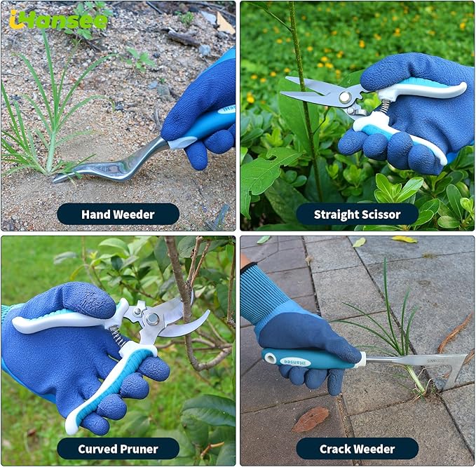 • Blue Garden Tool Sets 12-Piece: Includes blue gardening hand tools 8pcs(scissor, pruner, crack weeder, trowel, hand fork, hand rake, trans planter, hand weeder, along with gloves, a kneeling pad, garden apron, and a multi-pocket storage tote bag to keep everything organized