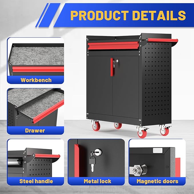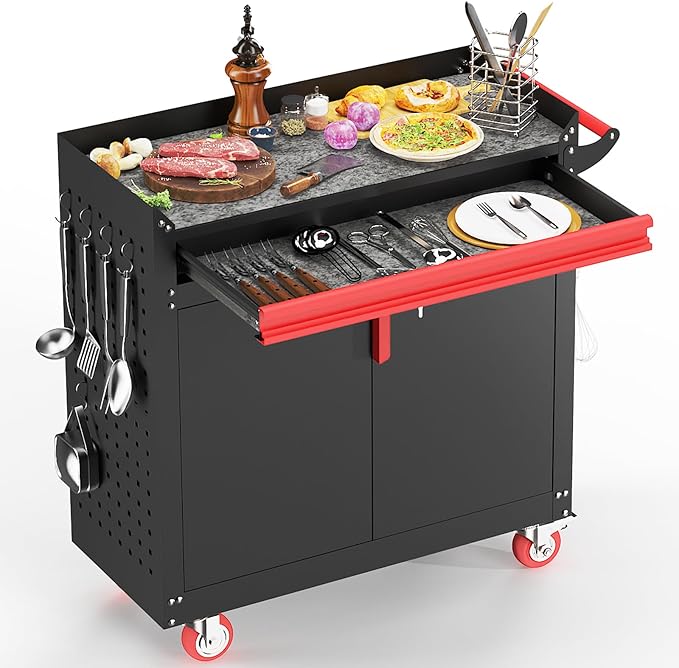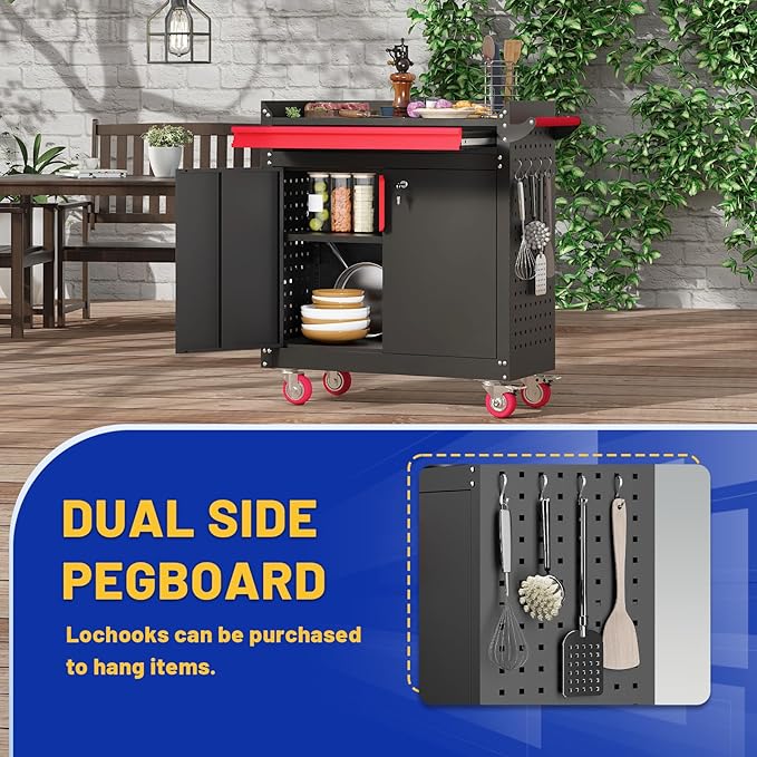• 【Ample Storage Space】The top tray of the outdoor grill table is the perfect grill side table for dinner plates and tools, providing you with ample placement area next to the grill. Outdoor grill cabinet has a dedicated slide-out drawer for easy on-the-go access to utensils, napkins and condiments. The lockable two-door cabinet (with magnetic doors) provides plenty of space for storing propane tanks or charcoal bags in a safe and secure manner. The pegboard design on both sides of the grill carts allows for hooks to hang paper towels and tools. It also provides ventilation.