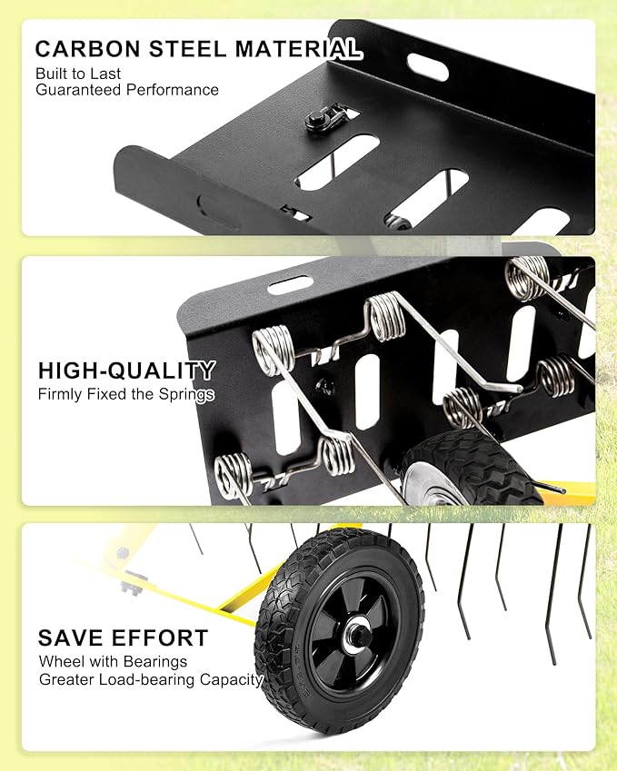 • Adjustable Height & Versatile Compatibility: The adjustable handle lets you raise tines to protect them on hard surfaces or lower them to aerate soil and remove thatch. Covering 40 inches in one pass, it saves time and maximizes results. A universal hitch fits most tractors, riding mowers, ATVs and UTVs, ensuring wide compatibility across different properties. Step-by-step instructions and an assembly video are included, allowing quick and safe setup for confident lawn care.