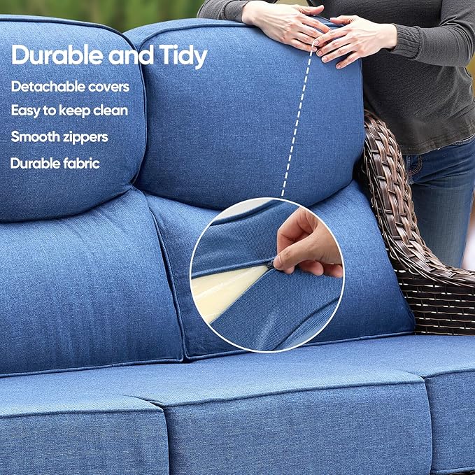 • 【DELUXE SMILE SHAPED CUSHION】: This wicker rocking chair has a 22-inch high backrest, the 6-inch cushion of the patio rocker swivel chair is made of high-density 28D foam, which strikes an ideal balance between softness and support, and its quick rebound feature maintains long-lasting shape and comfort, and the backrest is made of three-dimensional spacer cotton for effective pressure relief. The cushion cover is made of premium OLEFIN fabric that is sun, water and fade resistant and is more comfortable and durable than regular polyester fabrics.