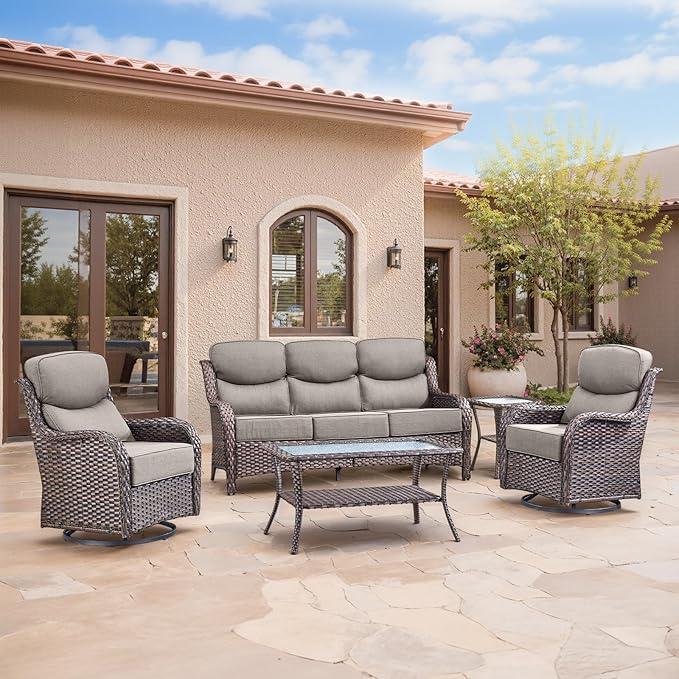 Swivel Patio Chairs sofa Set of 5 with 6" Thick Cushion - Wicker Outdoor Swivel Rocker Patio Chair ,Sofa/Glass coffee table, High Back Comfortable Outdoor Glider Chairs - Brown Wicker Grey Cushions
