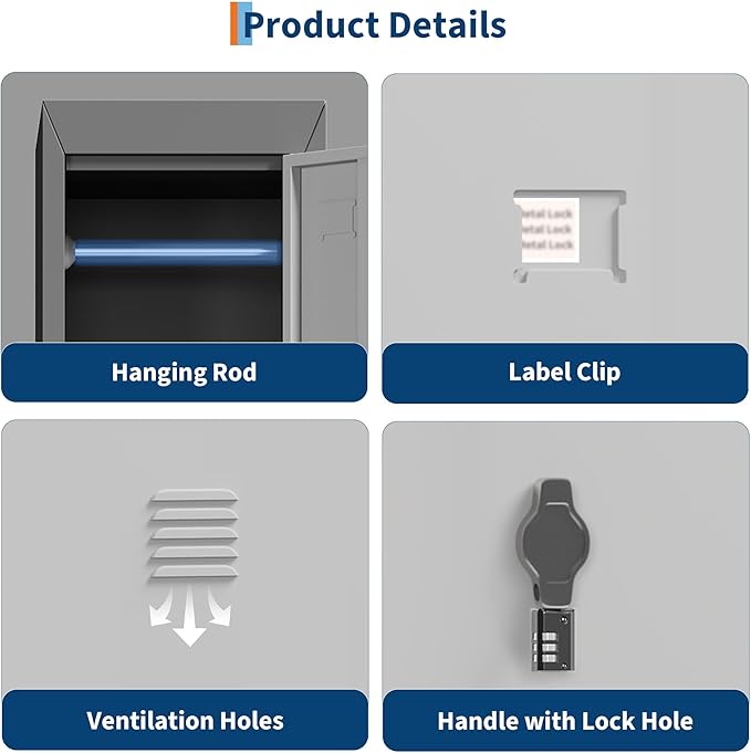 • Ventilated Design: Each metal locker door is equipped with built-in louvers that promote airflow, reducing moisture and odors to keep stored items dry and fresh