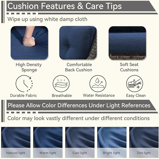 • [Easy-Clean Cushions] Wipe with a white damp cloth for easy clean. Allow for color differences in different ambient light and displays
