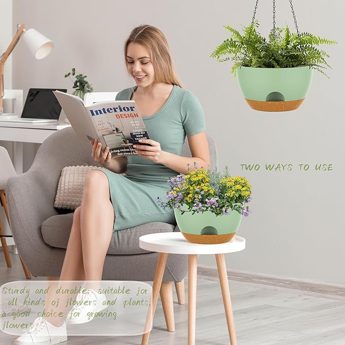 • 【Self-Watering Hanging Flower Pots with Removable Saucer】the appearance and structural design of the Hanging Pot prevents overwatering and acts as a water reservoir to promote Plant growth. It is suitable for a variety of Hanging Pot Plants, such as ivy, Herbs, Ferns, Philodendrons, Succulents, Flowers or other Plants