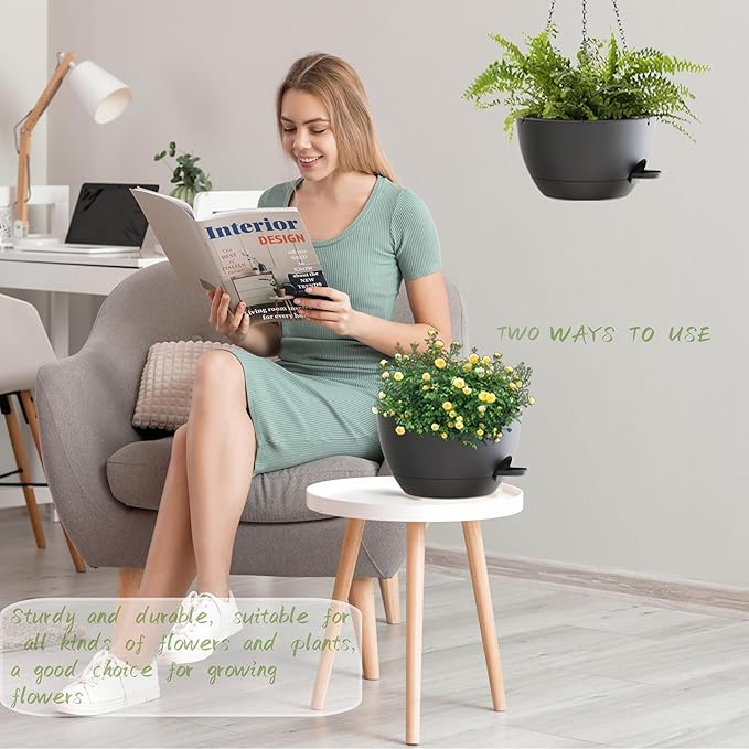 • 【Self-Watering Hanging Flower Pots with Removable Saucer】the appearance and structural design of the Hanging Pot prevents overwatering and acts as a water reservoir to promote Plant growth. It is suitable for a variety of Hanging Pot Plants, such as ivy, Herbs, Ferns, Philodendrons, Succulents, Flowers or other Plants