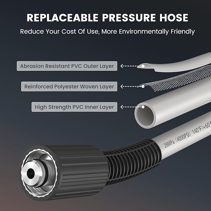 • 100 FT Replaceable Pressure Hose: Giraffe Tools Pressure Washer Plus+ featuring a 100 ft replaceable hose(32 °F-140 °F). Constructed with three-layer composite anti-explosion material, it's designed to tackle even the toughest cleaning jobs. The detachable hose is for easy recycling and reuse, reducing the amount of product waste