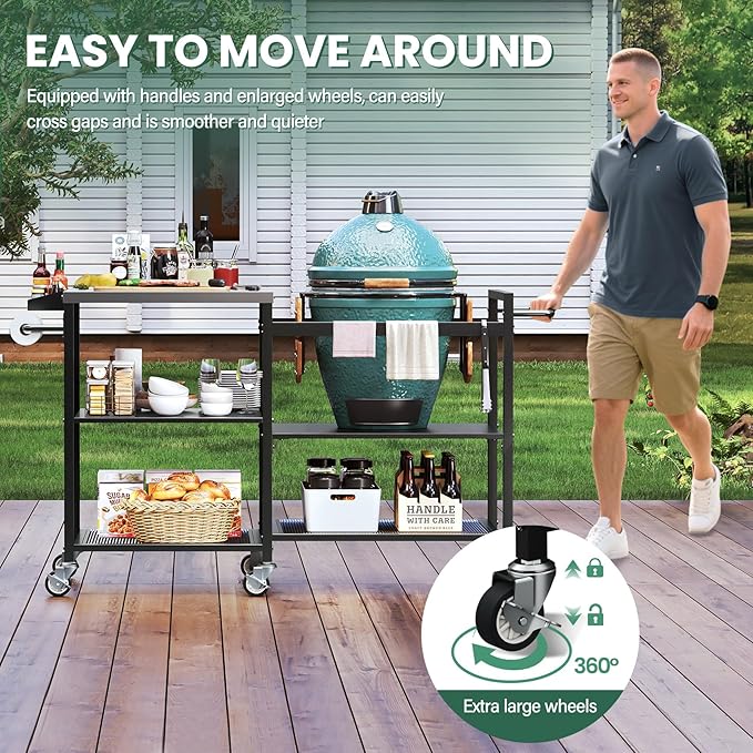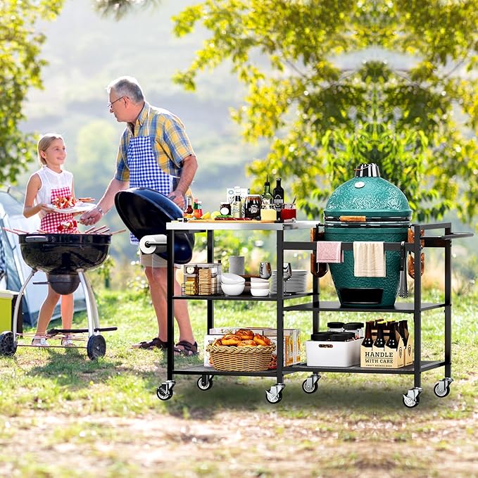 • 【Ample Storage Space】The cart offers versatile storage options. In addition to the stainless steel prep top, it features three big shelves for organizing utensils, ingredients, charcoal, and more. The side is a spice rack and a paper towel holder—so your seasonings and paper are always easy to reach. Everything stays neat and close by, making your cooking easier and more efficient.