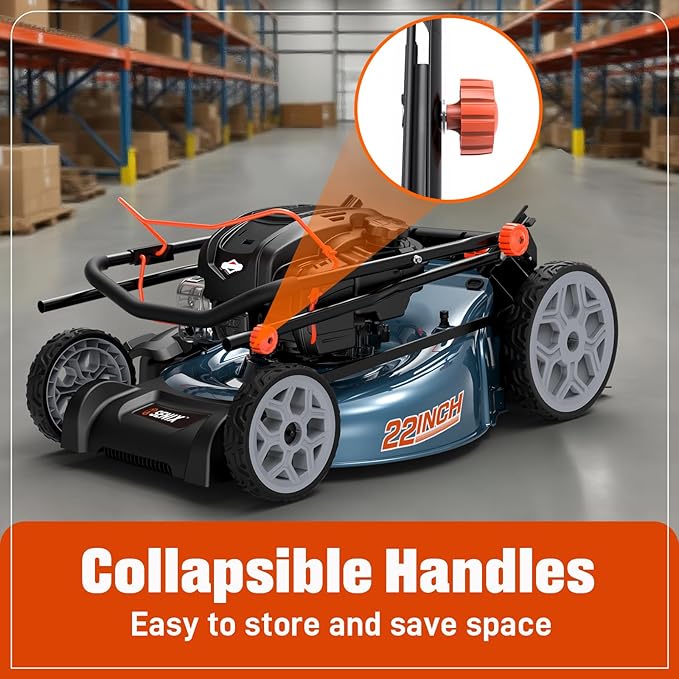 • Effortless Yard Maintenance: Featuring a 22-inch cutting deck, this self propelled lawn mower ensures swift and efficient coverage, ideal for small to medium-sized yards. Its foldable handle and vertical storage design optimize space in your garage or shed