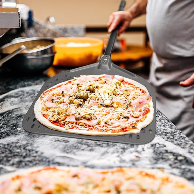 • 【RECTANGULAR PERFORATED HEAD】The 14" x 17" milled aluminum head boasts a beveled edge for easy handling, allowing pizzas to slide in smoothly. The perforated design of pizza spatula reduces the need for excessive cornmeal or flour, ensuring your pizza comes out crispier and more flavorful, with less sticking