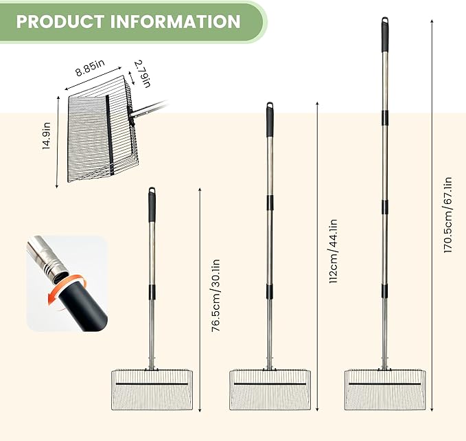 • ✅ 3-section telescoping handle (30-67 inches) for coop scoop: Adjusts to multiple lengths to reach tight coop corners, deep piles, or high areas—this coop scoop reduces bending, eases back strain, and cuts down cleaning time significantly. Made of rust-resistant stainless steel, ensuring the chicken coop scoop stays sturdy enough for daily use even with frequent handling. This chicken poop scooper is perfect for home chicken keepers or small-scale farmers, and no more sore backs from hunching over when using the chicken scooper for poop!​
