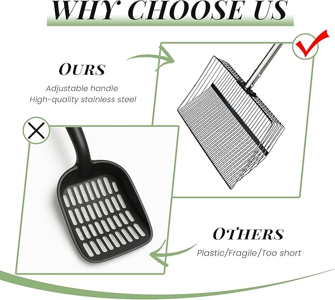 • ✅ Durable stainless steel construction for chicken coop scoop: The entire scoop (head + telescoping handle) of this chicken coop scoop is made of high-grade rust-resistant stainless steel. This sifting shovel handles damp manure, thick bedding, and compost without bending, tearing, or rusting—exactly what you need from a reliable chicken poop scooper. It maintains shape and performance even with frequent heavy use, and the chicken scooper for poop won’t wear out quickly, so no more replacing flimsy plastic or cheap metal scoops every few months!​