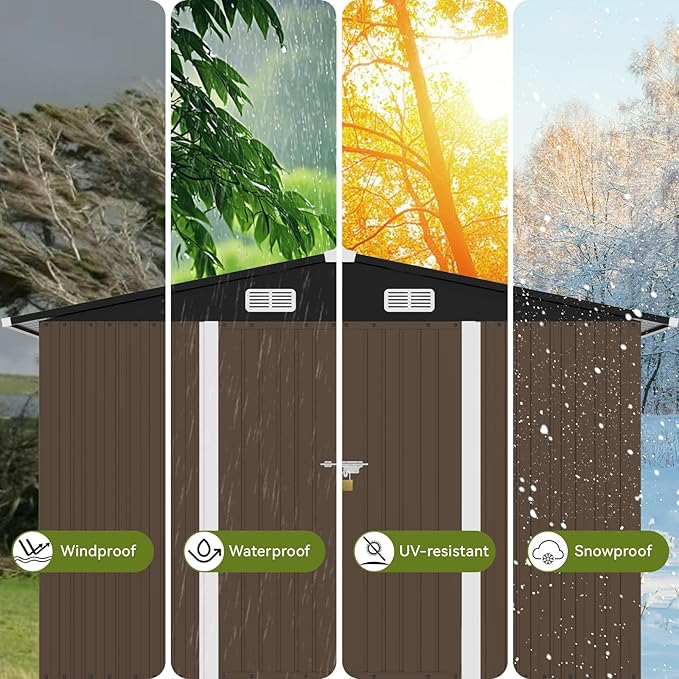 • Waterproof Tool Shed:The sloping roof design of this storage outdoor shed maximizes space utilization;effectively direct rainwater away from the structure to prevents the leakage,Don't worry about your items getting wet