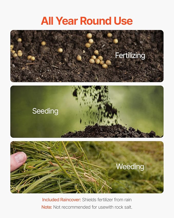 • All-Year-Round Versatility: Our garden seed spreader deal for spring seeding, summer fertilizing, and winter salting, replacing four tools with one. Suitable for home lawns and small farms.