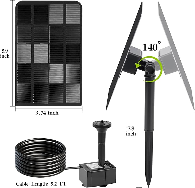 • The solar water fountain kit includes 1 adjustable solar panel, 1 water pump with 9.54FT power cable, 5 spray nozzles,3 nozzle connectors and 1 solar panel stake