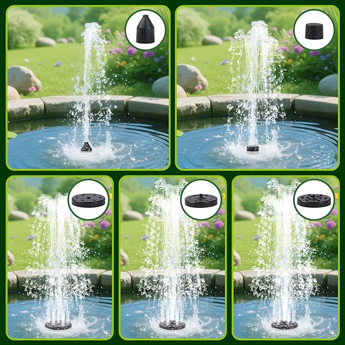 • 5 water spray nozzles are available in different spray shapes and heights, simply fit the connector to the pump connection and attach the nozzle,and you can a perfect water fountain