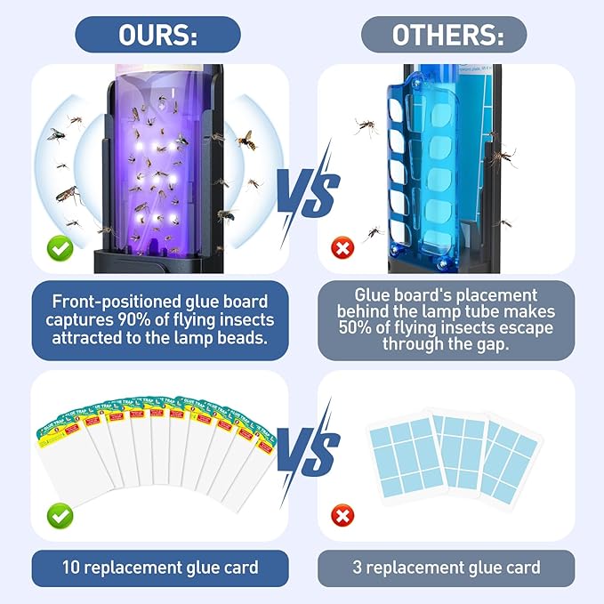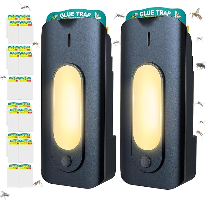 • 【Upgraded Fly Trap Indoor】Traditional fly traps have flaws: lamp-post type designs lose 50% capture rate due to gaps, while bottom-upward light types waste 50% of the divergent light. Our solution adds 9 LED lamp beads on the back-panel that diffuse puncture light onto a transparent glue board, so that the flying insects 90% can be trapped on the transparent glue board by the puncture light.