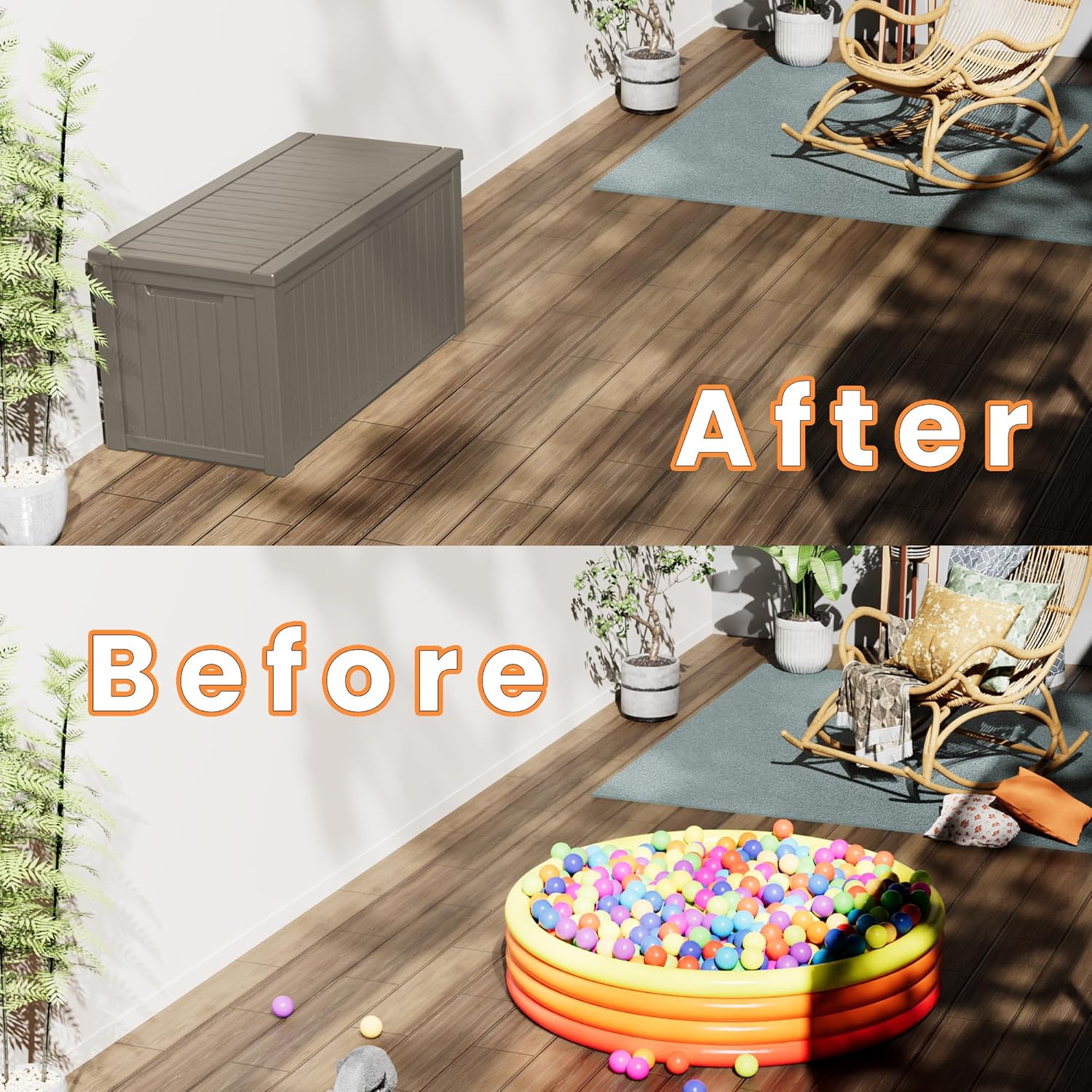 • 【Weatherproof Resin with Anti-Fade Technology】 Fade-proof resin with wood grain finish resists sun bleaching and rain damage. Sealed lid keeps contents dry—ideal for "weatherproof outdoor storage", "resin deck box", and "garden hose storage" needs.