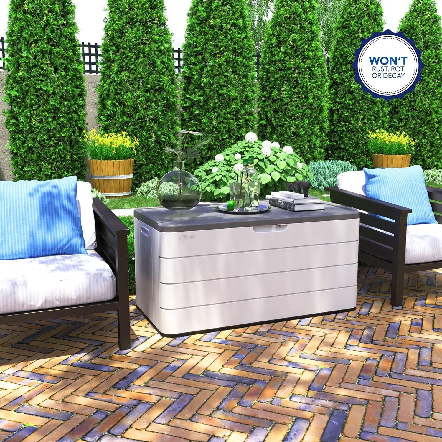 • 【100 Gallon Large Capacity】 Spacious 100 GAL interior stores patio cushions, garden tools, pool floats, and outdoor toys. Doubles as a storage ottoman, side table, or bench for deck, patio, and backyard spaces.
