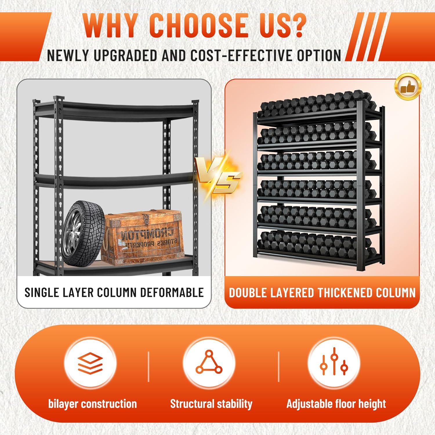 • 【High-Quality Steel with Anti-Rust Coating】Constructed with a thick, heavy-duty metal steel frame featuring a rust-proof black coating for superior corrosion and wear resistance. Ideal for humid environments (like basements and warehouses), this shelving unit maintains its structural integrity without warping or deformation over time.