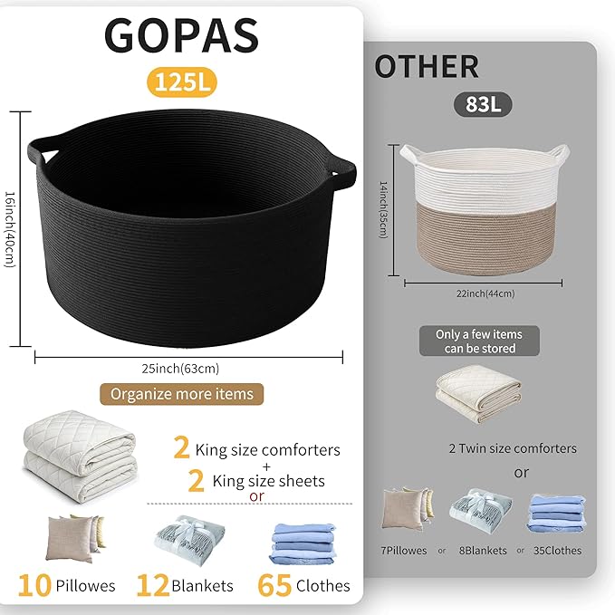 125L Extra Large Blanket Basket, 25" x 16", Jumbo Laundry Woven Baskets Decorative Home, Cotton Rope Basket with Handles, Baby Toy Baskets for Storage, Black, 2PC