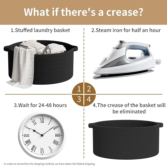 • Note: Blankets basket comes folded and may have creases. Fully fill the rope basket with towels or clothes and wait for 1-2 days will help reshape the blanket basket. Alternatively, use steam or ironing for a quick reshape the laundry basket