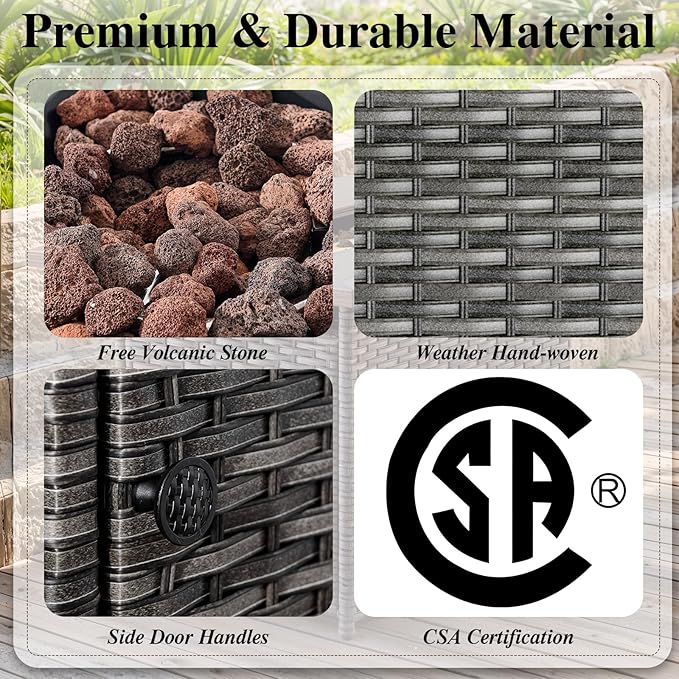 • Auto-ignition Fire Pit:The gas fire pit can reach up to 50,000 BTU heat output and is equipped with an integrated electronic ignition,It is CSA certified and undergo rigorous inspection and testing before leaving the factory to ensure reliability and safety.It can be used as a coffee table with the lid.
