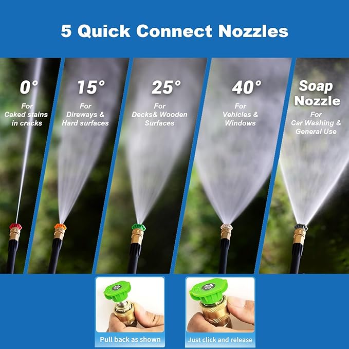 • UPGRADED ACCESSORIES: The Commowner portable pressure washer 2.0 comes with top-of-the-line accessories for a thorough cleaning experience; Navigate with ease using the 33-foot real rubber hose, choose from 5 QC nozzles (0°, 15°, 25°, 40°, soap) for different cleaning needs, and enjoy additional features like the 500ml detergent tank, metal lance, spray gun, cleaning pin, welcome guide and 20-foot electric cord
