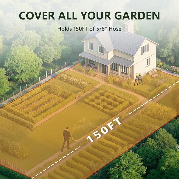 • 【Extra Large Storage Capacity】: This hose storage rack can perfectly accommodate a standard 5/8-inch garden hose up to 150 feet in length, easily covering every corner of a large yard. Whether it's the front lawn or the back garden, one hose is enough to meet all your watering needs. (Note: This product only includes the guide hose, and the main hose needs to be purchased separately.)