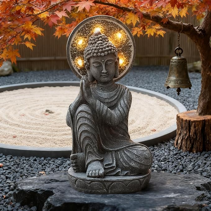• ✅【Eco-Friendly Solar Illumination】: As a solar Buddha feature for your garden, this garden Buddha statue outdoor is equipped with a built-in solar light. It absorbs sunlight during the day and provides gentle illumination for 6-8 hours at night, enhancing the ambiance of your garden or outside space with a soft glow. Please ensure the back switch is in the "ON" position before use.