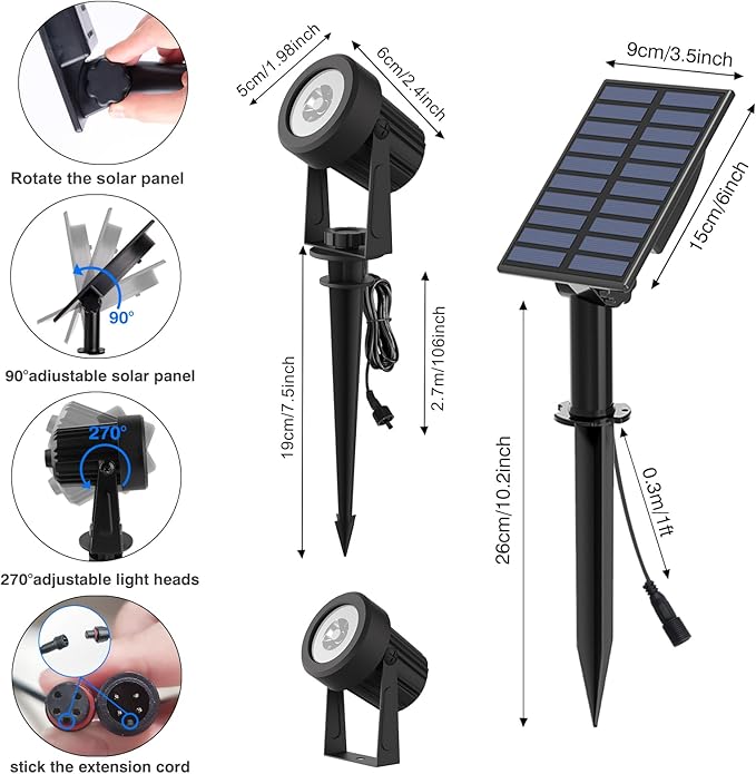 • Fully Adjustable & Wide Coverage: The 90° adjustable solar panel and 180° rotatable light head provide broad, bright lighting perfect for driveways, pathways, gardens, and more. These stylish outdoor spotlights blend seamlessly with any decor.