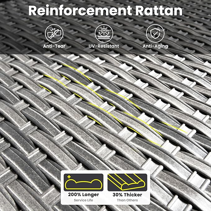 • All-Weather Rattan: Crafted from handwoven premium PE wicker with intricate handwoven detailing, this set is UV-resistant, waterproof, and built to withstand sun, rain, and wind. Its durable construction ensures long-lasting beauty without fading or cracking