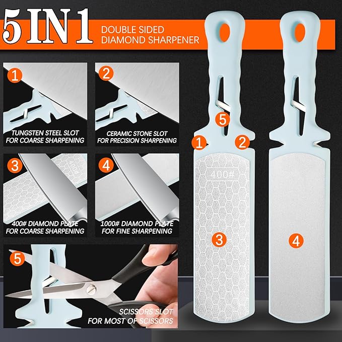 • 5 in 1 Sharpening Stone:The front side 400# coarse sharpening is used to repair severely dulled blades, and back side 1000# fine sharpening is used to re-sharpen the edges and deburr the blade. The lightning slot in middle of handle is for Scissors Grinding. Left waist of the handle is tungsten steel blade sharpens to restore the knife's V-shape,and the right waist of the handle is ceramic blade sharpens for polish and eliminates burrs on the metal blade.