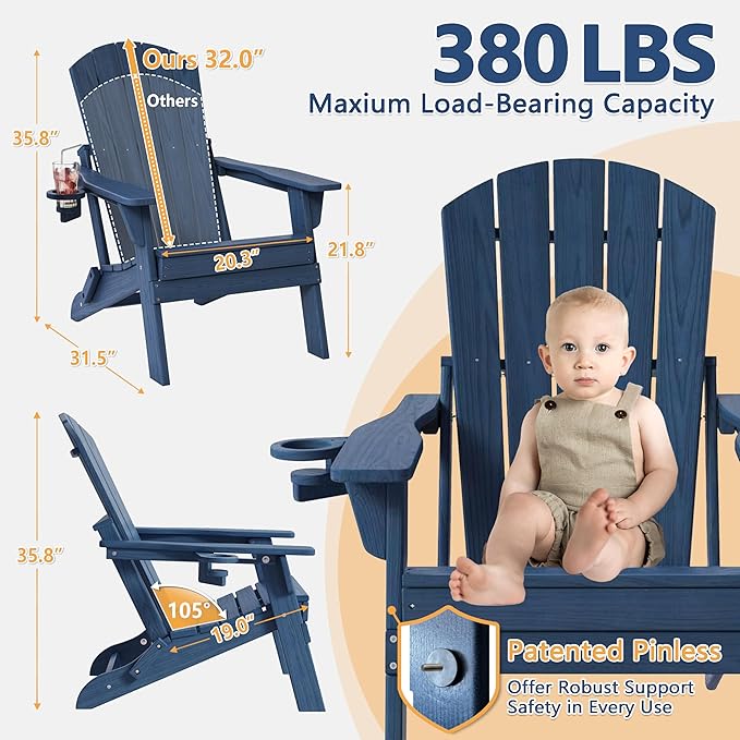 • Durable HDPE Material–Built to Withstand the Elements: Made from high-density polyethylene (HDPE), this Adirondack chair offers superior resistance to weather, fading, and cracking. Unlike wood, it won't rot, peel, or splinter, making it ideal for year-round outdoor use with virtually no maintenance required.