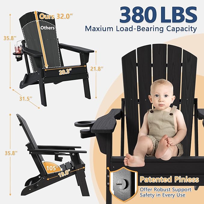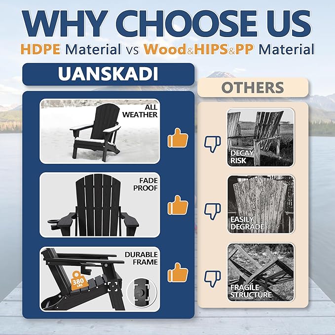 • Durable HDPE Material–Built to Withstand the Elements: Made from high-density polyethylene (HDPE), this Adirondack chair offers superior resistance to weather, fading, and cracking. Unlike wood, it won't rot, peel, or splinter, making it ideal for year-round outdoor use with virtually no maintenance required.
