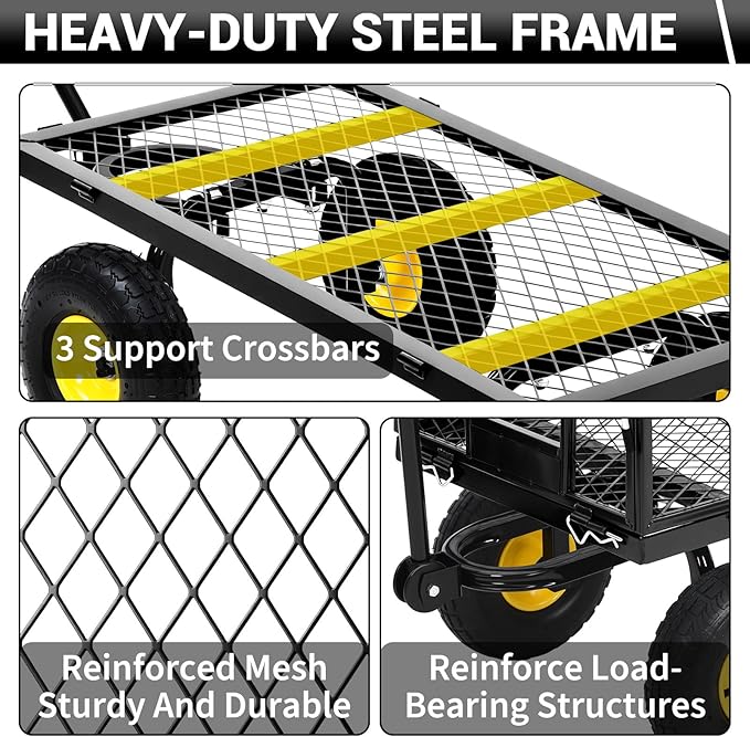 • STRONG ALL-STEEL CONSTRUCTION: This gardening wheelbarrow is made of high-quality steel for excellent durability and corrosion resistance. The entire cart includes an all-steel mesh bed designed to withstand heavy loads and harsh weather conditions. Invest in this gardening wheelbarrow that will not only meet your expectations, but exceed them, providing you with a reliable experience that will stay with you for years to come.