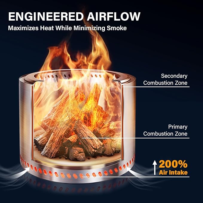 • Smokeless Innovation & Efficiency: Advanced 360° airflow technology creates an efficient, smokeless burning experience. Our innovative design maximizes heat output while minimizing smoke, making outdoor gatherings more enjoyable. Perfect for wood or pellet fuel, ensuring consistent performance and warmth