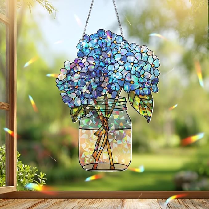 Hydrangea Flower Stained Glass Suncatcher – Acrylic Window Ornament, Sun Catchers Indoor Window Decor for Kitchen and Garden Gift, Housewarming Xmas Gift for Mom, Nana, Grandma